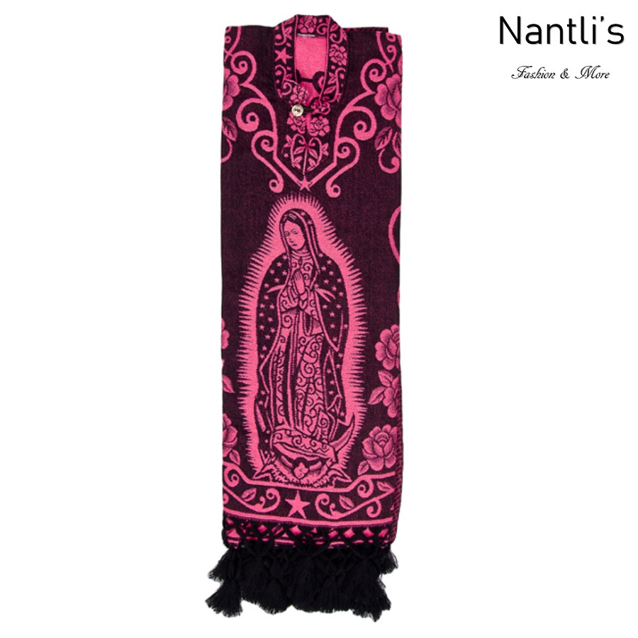 TM-73403 Black-Pink Rebozo-Capa Mexicano Estampado de Virgen de Guadalupe 76×36 mayoreo wholesale Nantlis Tradicion de Mexico